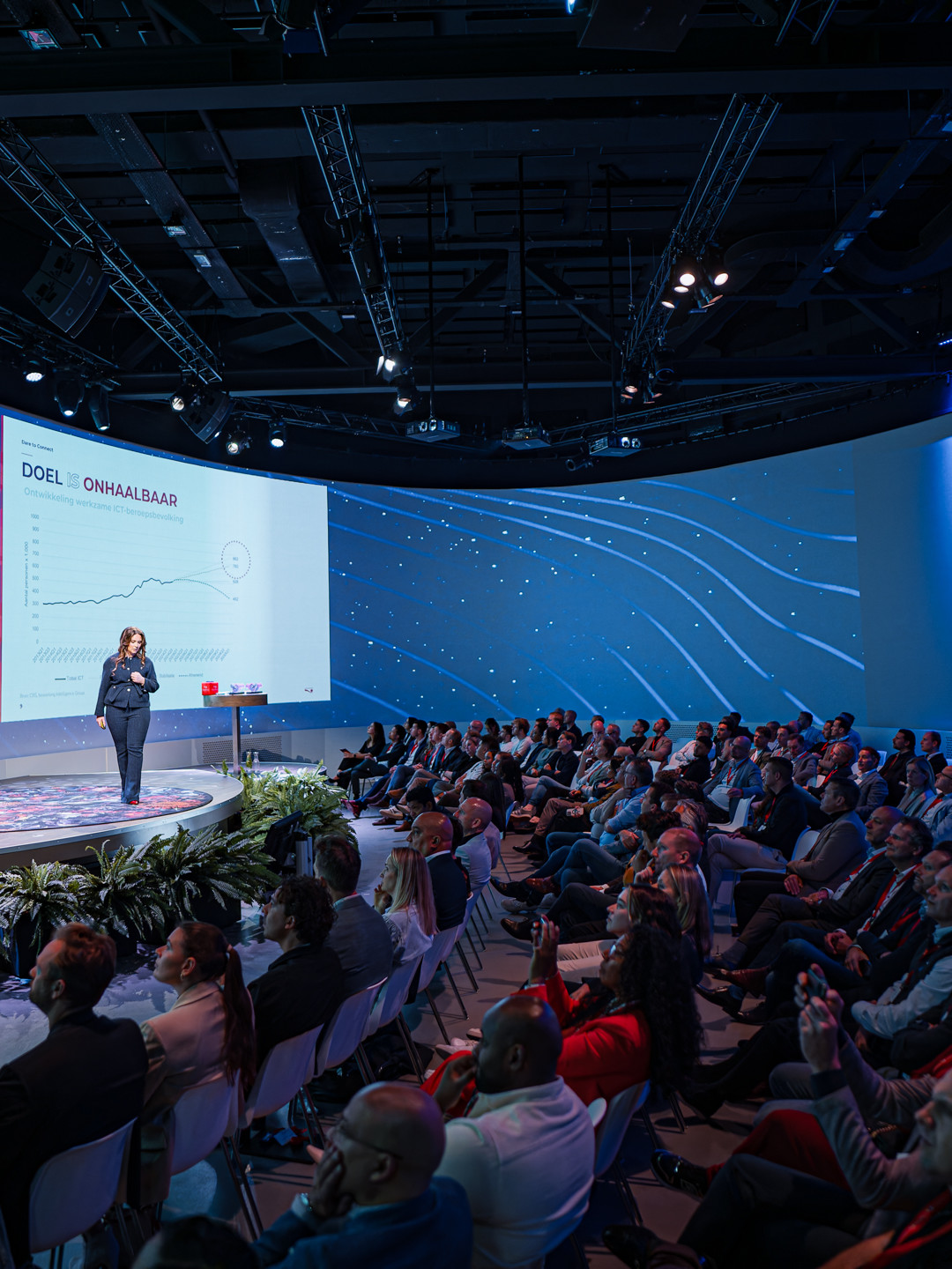 Wat de locatie extra bijzonder maakt, vertelt eventmanager Lieke, is het 180-graden projectiescherm. Dit scherm creëert een unieke beleving en biedt enorme creatieve mogelijkheden. “Bij ons Dare to Connect-evenement veranderde de zaal door visuele effecten in een heuse ruimte-ervaring. Een goed voorbeeld van zo’n memorabel moment.”